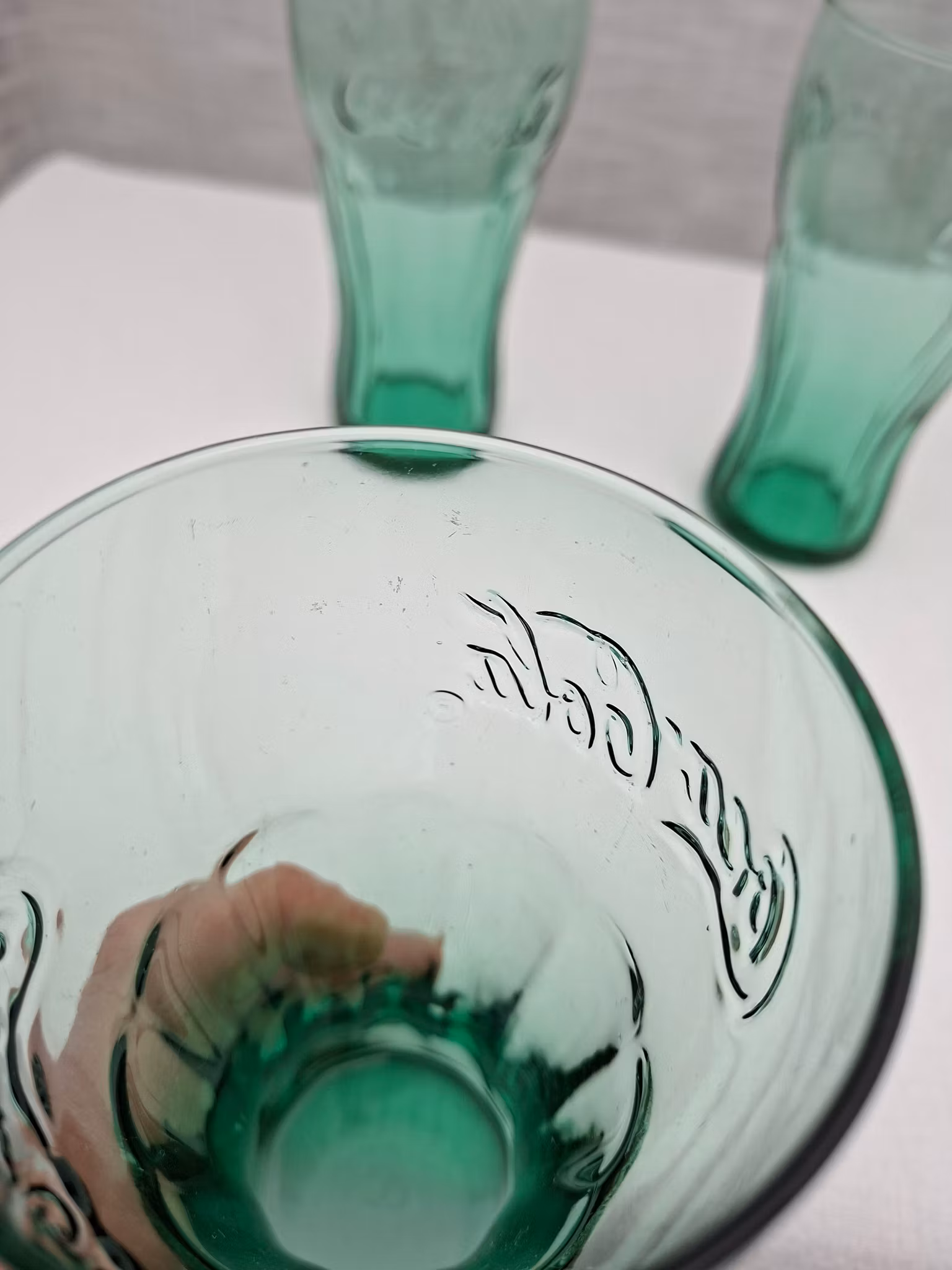 Coca Cola glas gröna med relief 3 pack2 st i fin bruksskick med något märke1 st med mer små märken i glaset