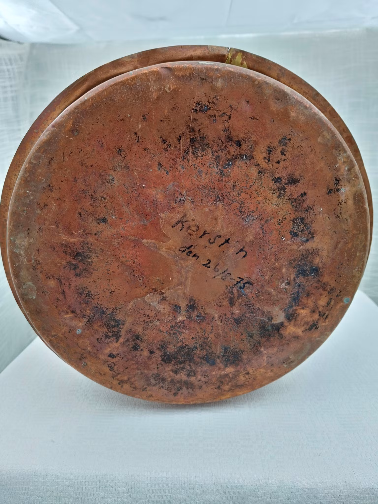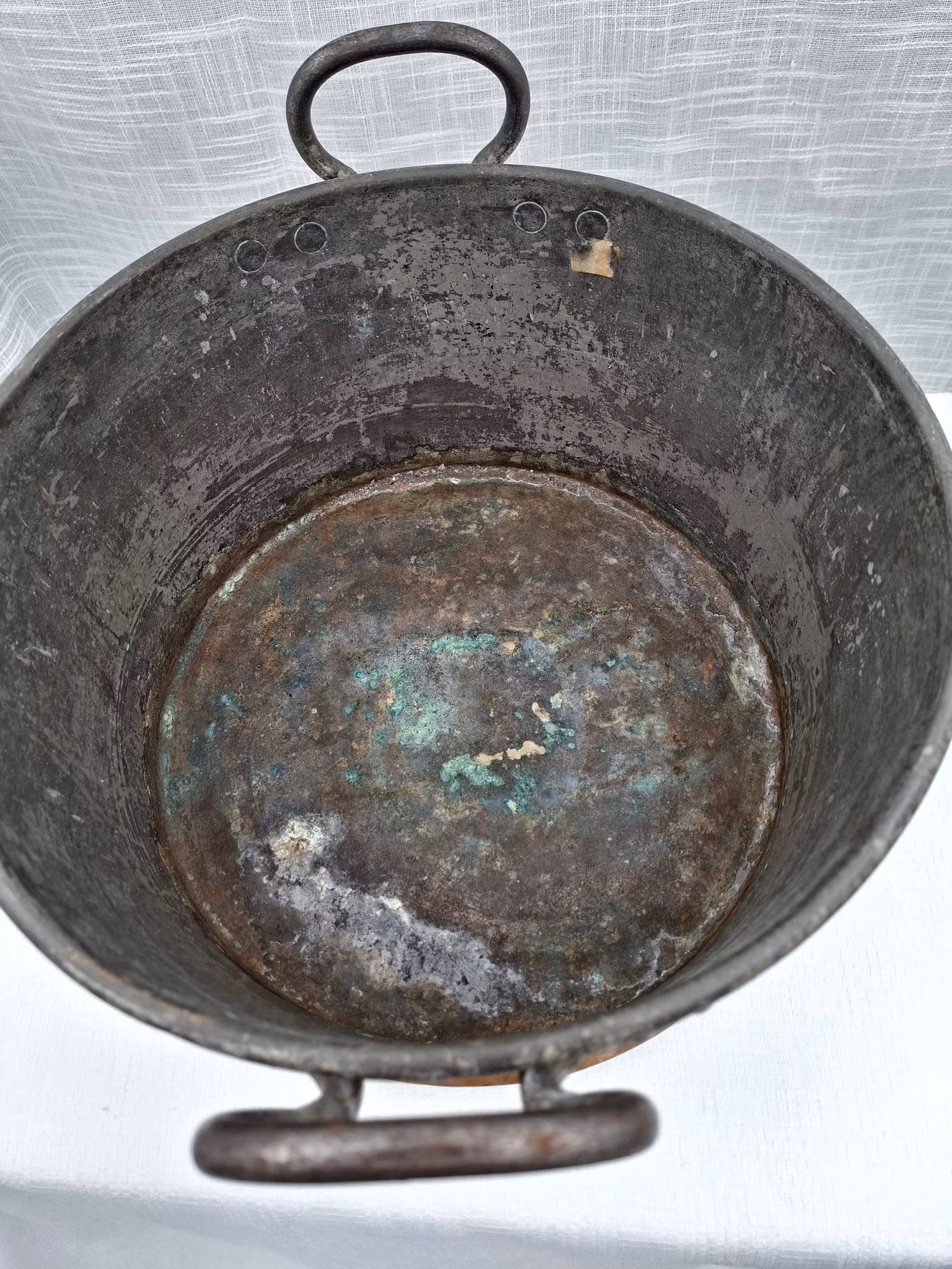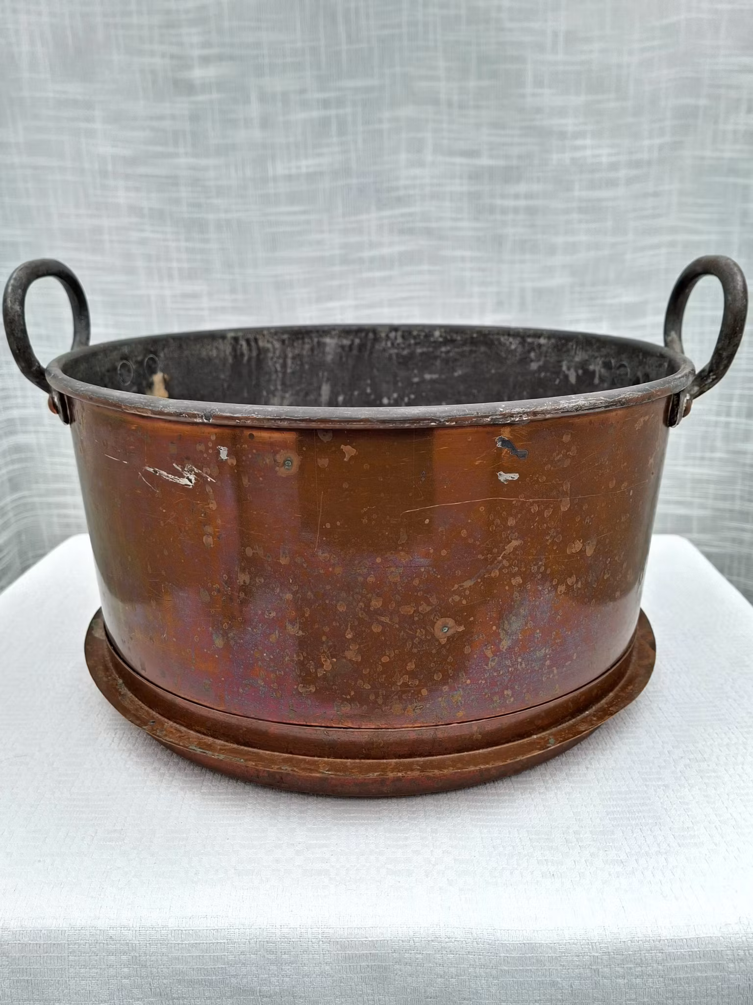Kopparbunke 30 cm 17 cm hög gammal bytta i koppar med smideshandtagHöjd ca 17 cmDiameter ca 30 cmÄldre bunke / bytta i koppar för tex plantering, ved etc.