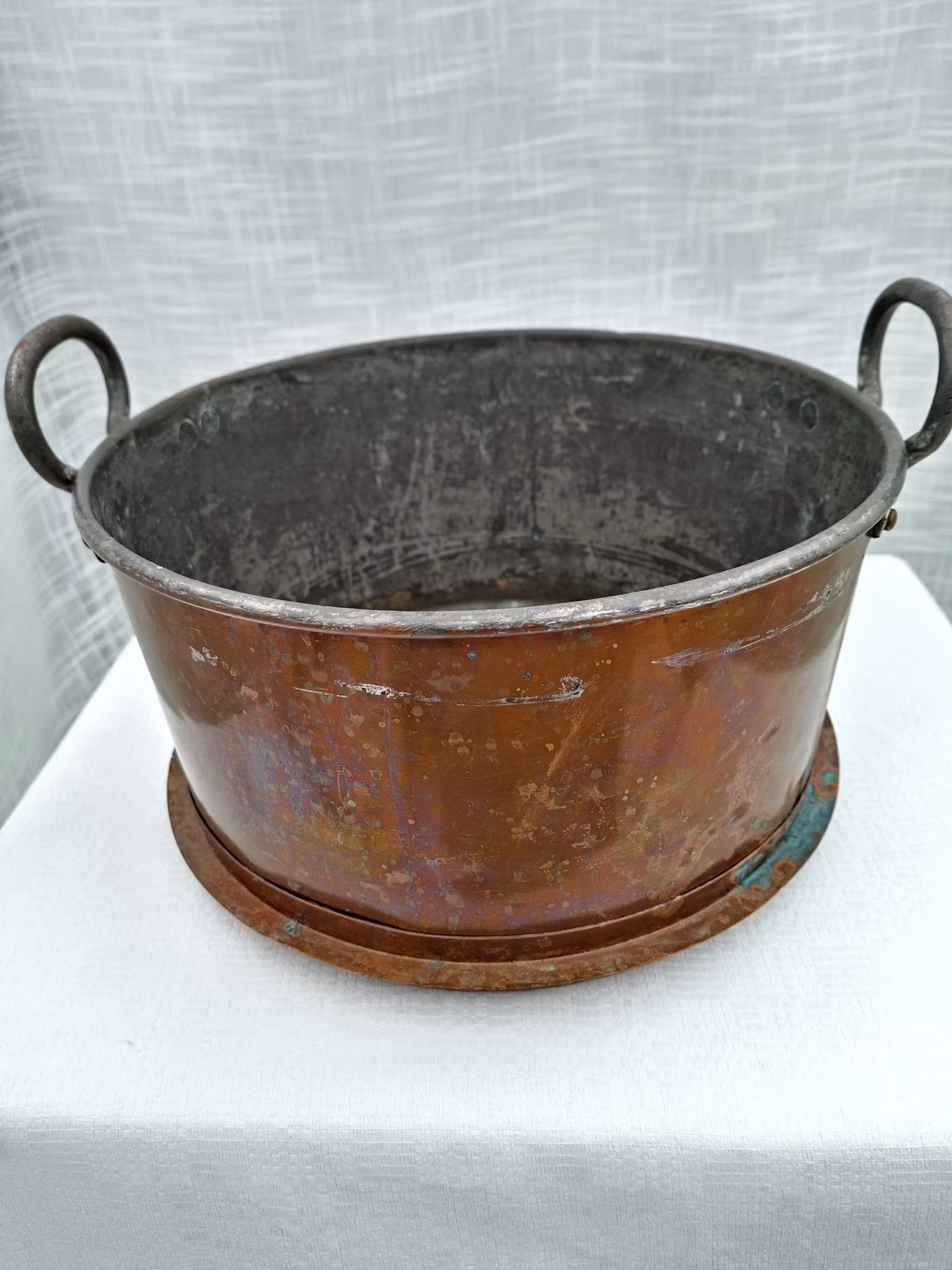Kopparbunke 30 x 17 cm äldre bytta i koppar med smideshandtag