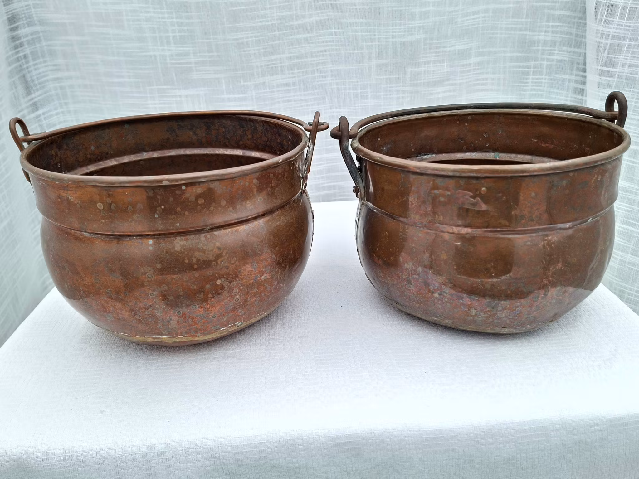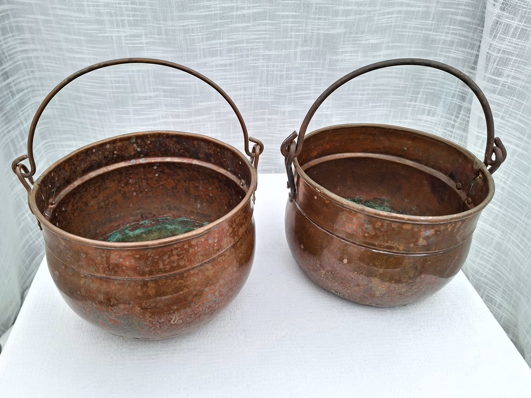 Kopparkrukor 2 st krukor i koppar med handtag så man kan ha dem som häng amplar, men passar så klart lika bra ståendes i fönsterkarmen