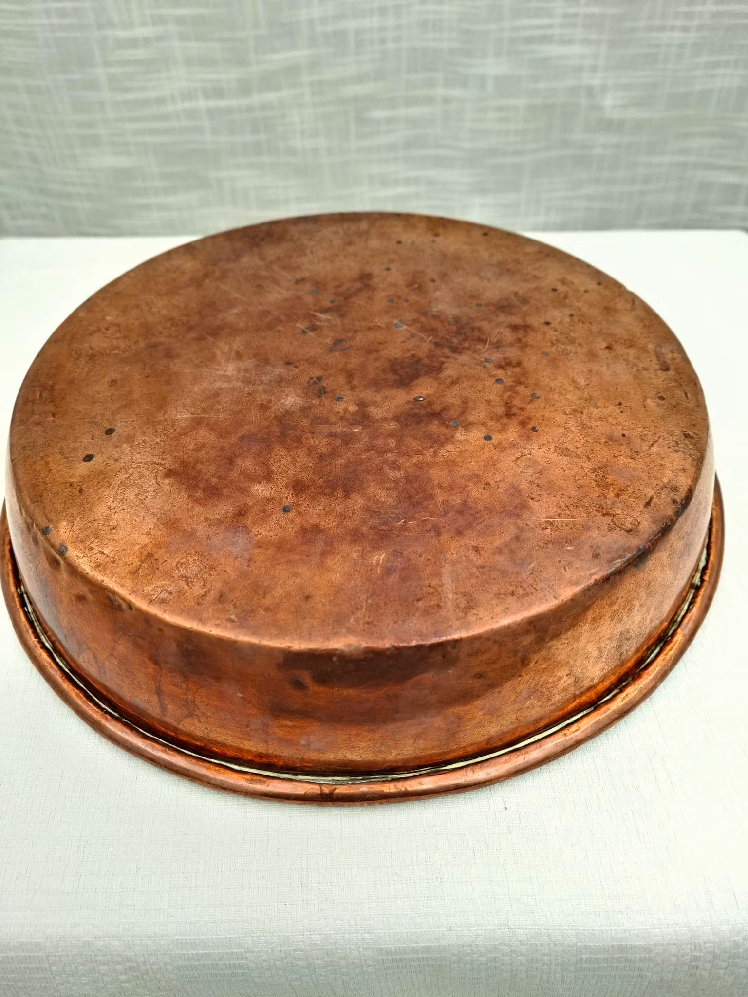 Kopparbakform 30 cm i diameterBegagnad äldre koppar form i fint använt bruksskick. Diameter ca 30 cmSom väggdekoration eller använd att plantera julgruppen