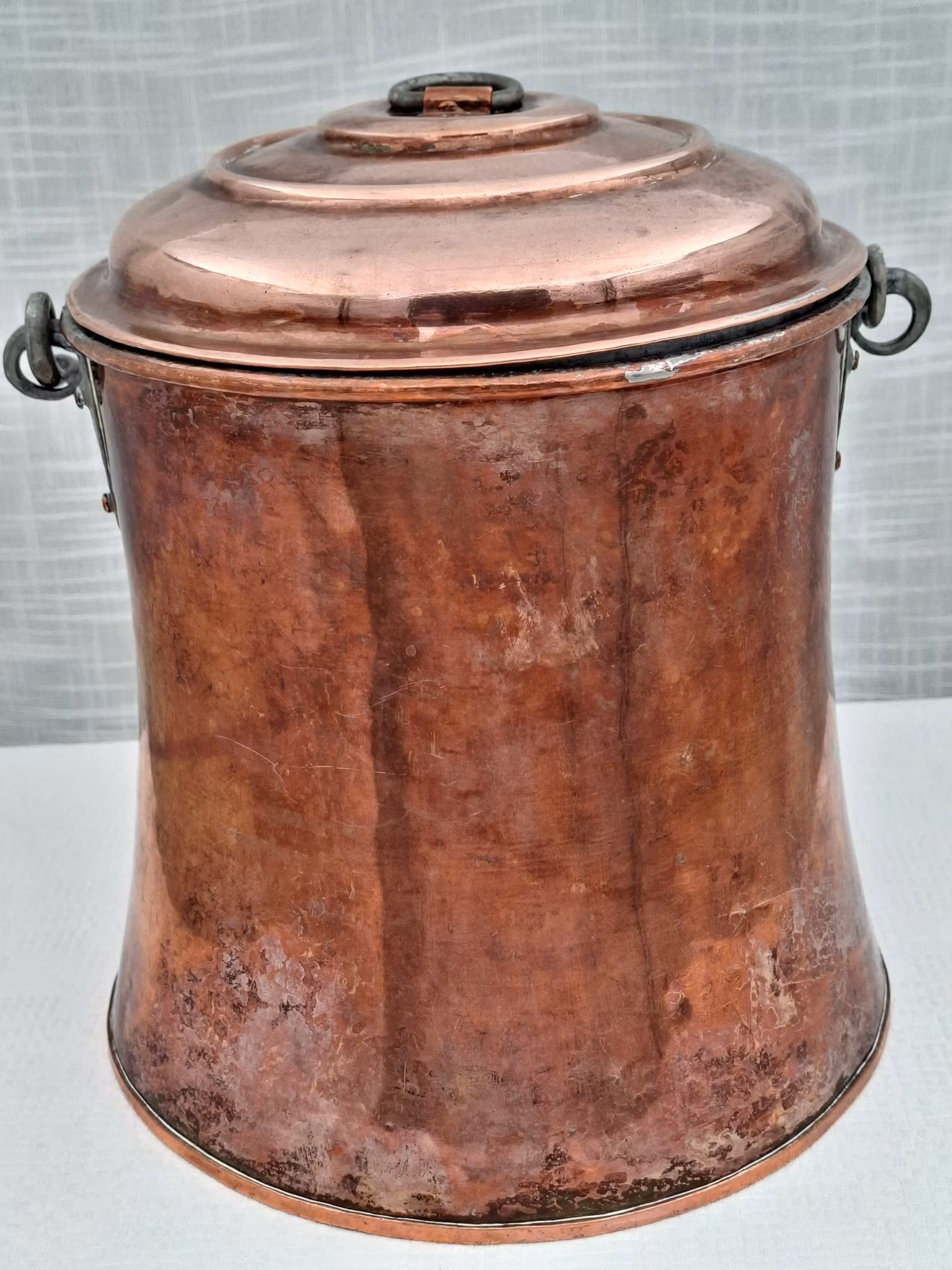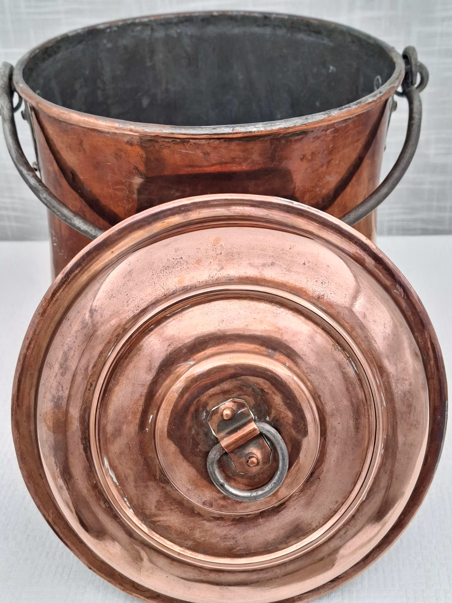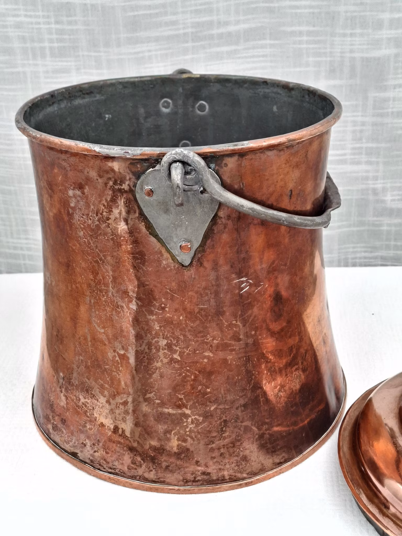 Äldre kopparbunke med lock med fina detaljer i handtagFint använt bruksskick. OputsadHöjd ca 21 cm mätt på bunken utan lockDiameter toppen av bunken ca 19,5 cm