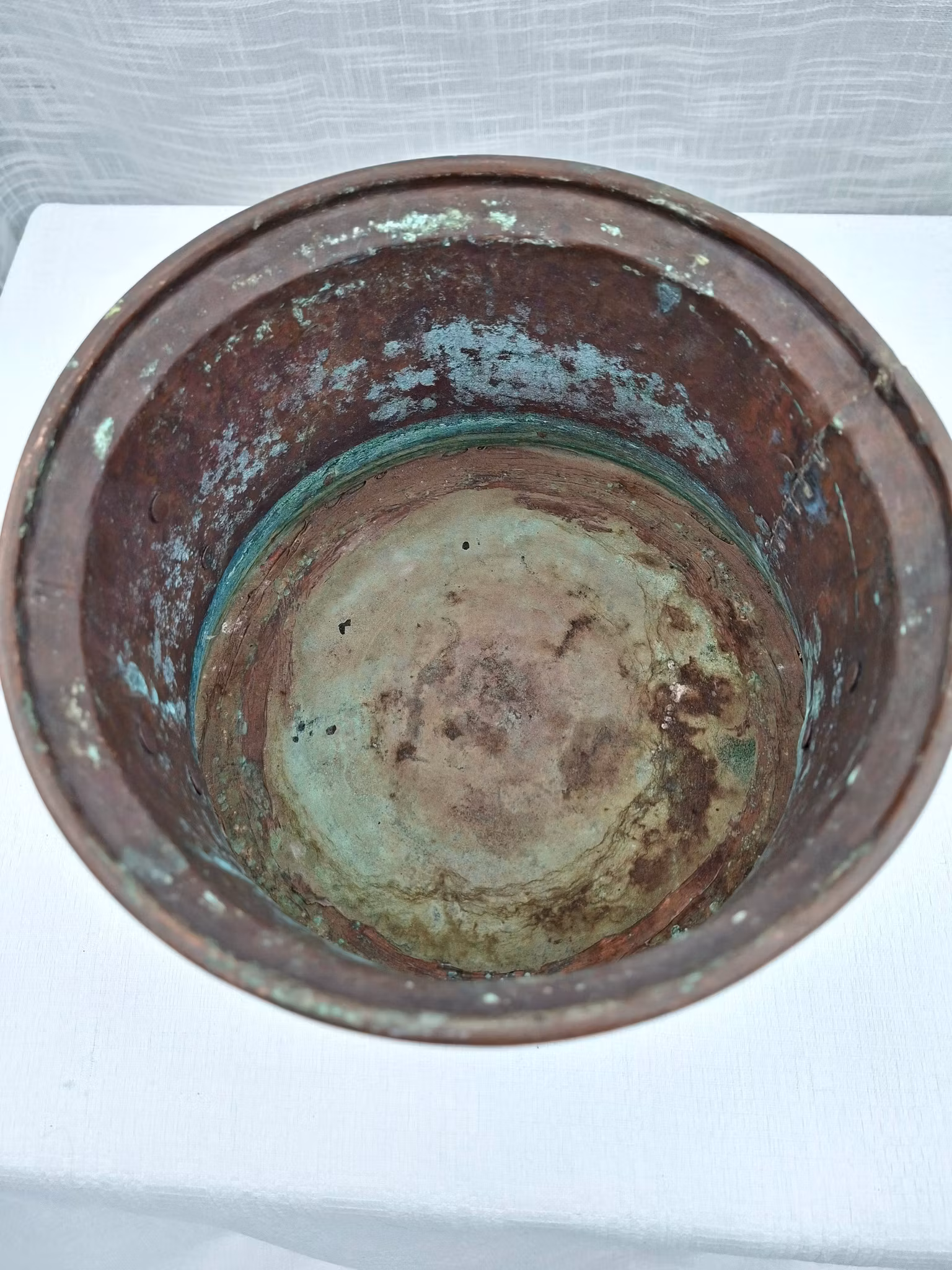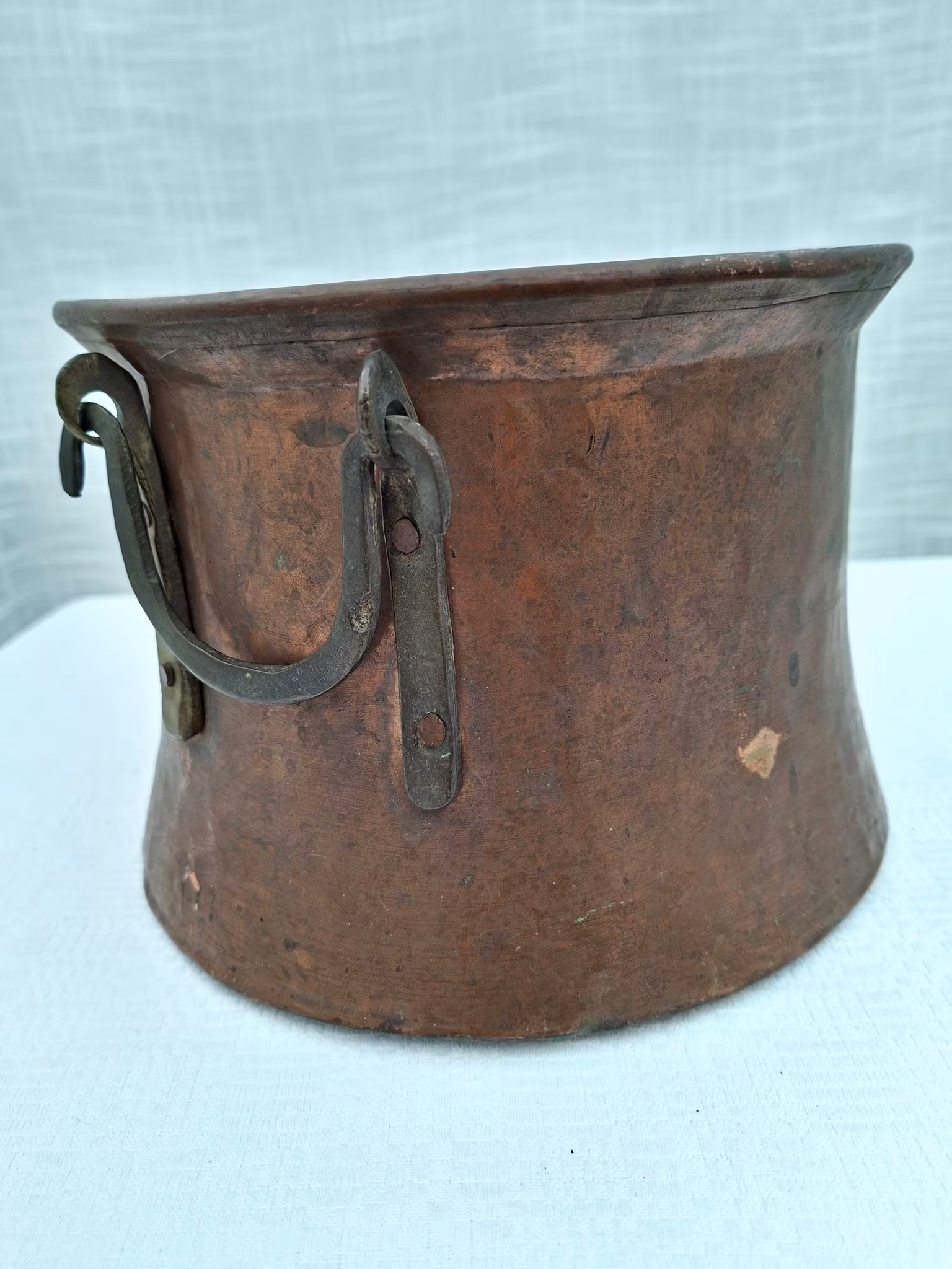 Äldre putsad kopparkruka med dekorativa handtag Höjd ca 15 cm Diameter ca 19 - 20 cm i toppen, något bredare i botten. Insvängd modell Äldre koppar kruka i fint bruksskick med smideshandtag