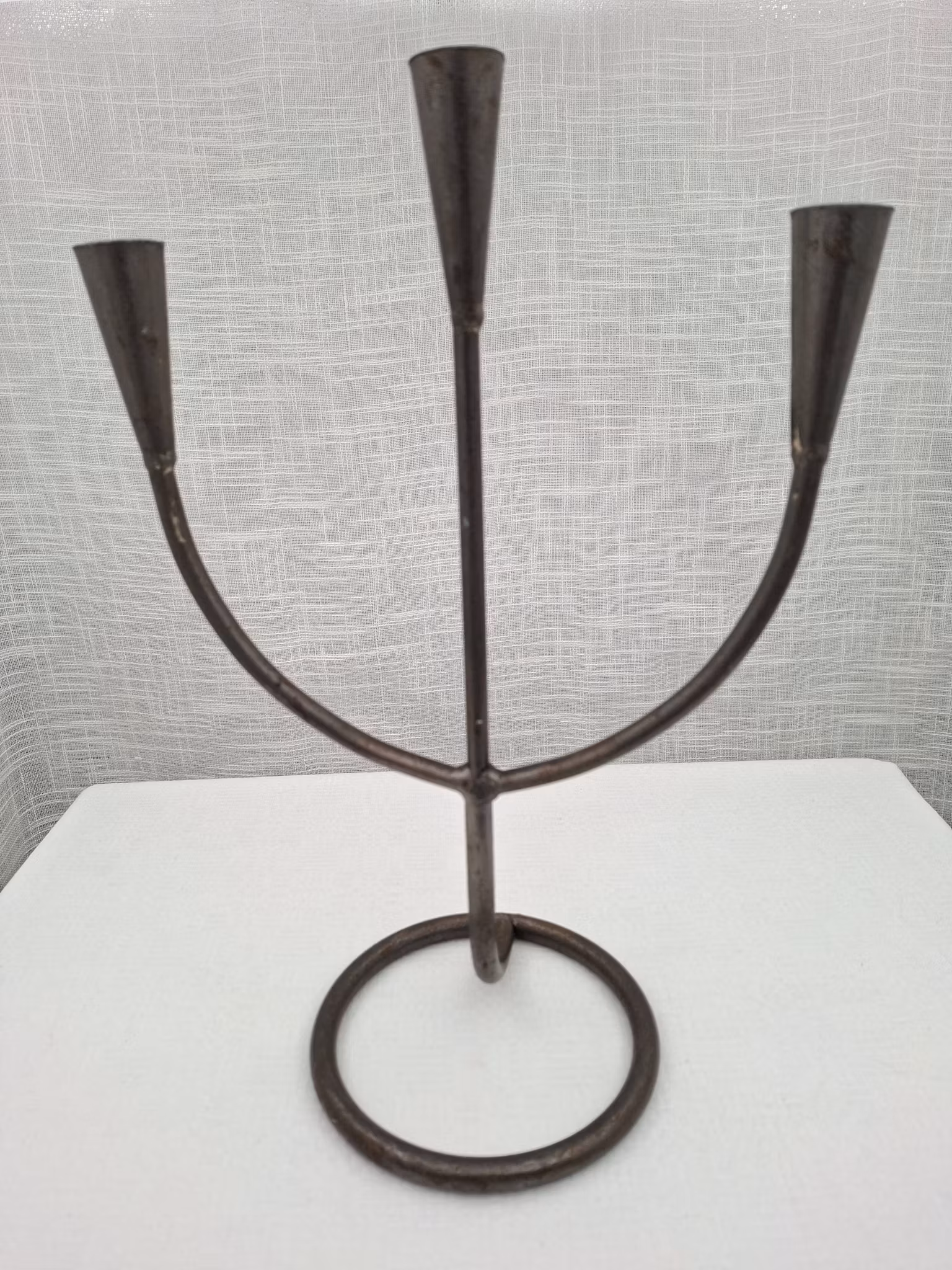 Smidesljusstake 3-armad enkel fin modellHöjd ca 33 cmBredd ca 23 cmBruksskick, stearinrester i ljushållarna