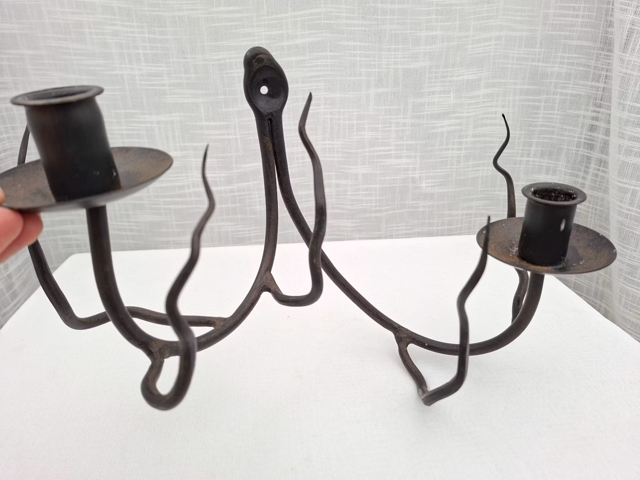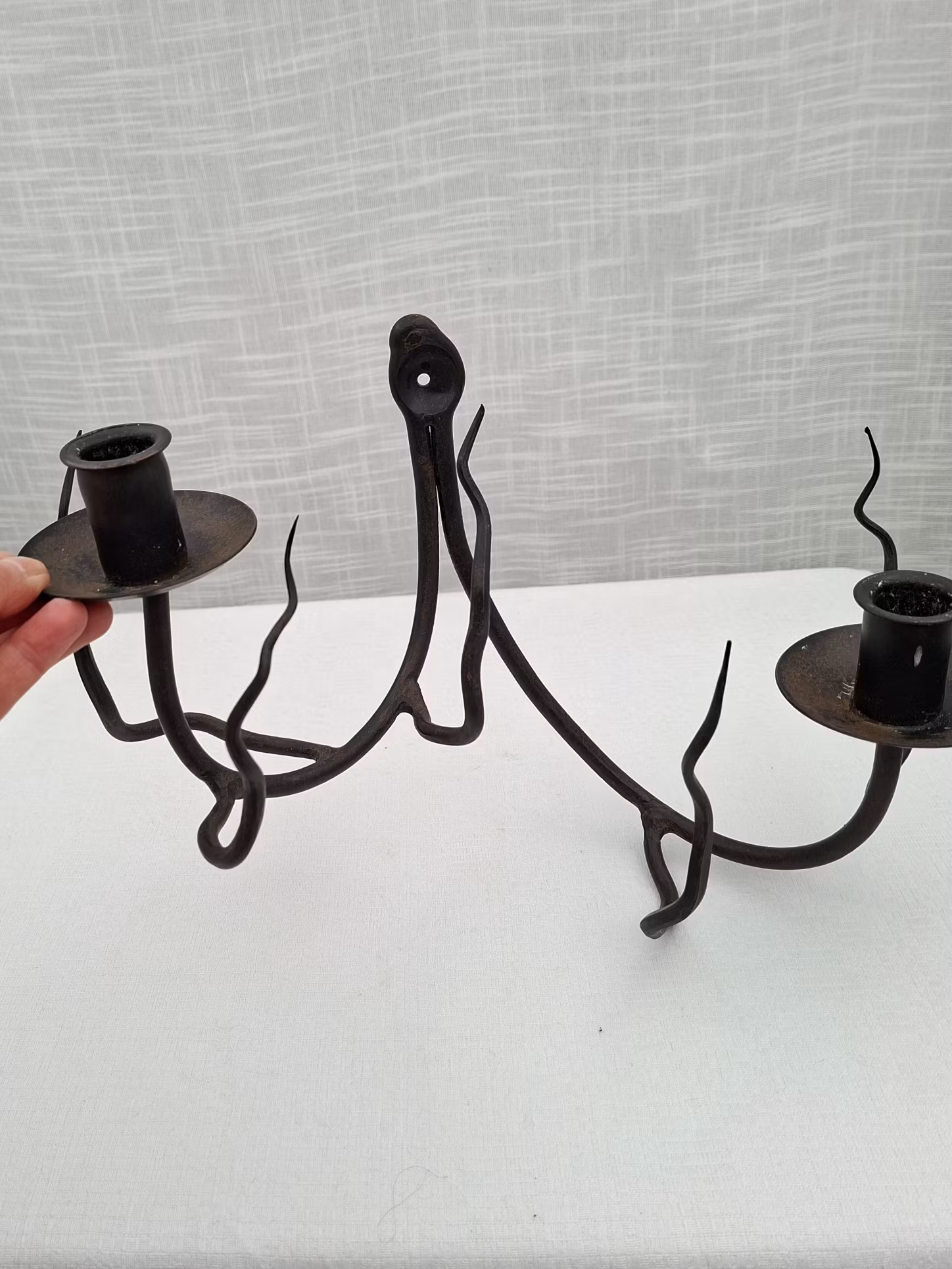 höjd ca21 cm bredd ca 31 cm Använt bruksskick med stearin rester i ljushållarna och några rost / skav märken.