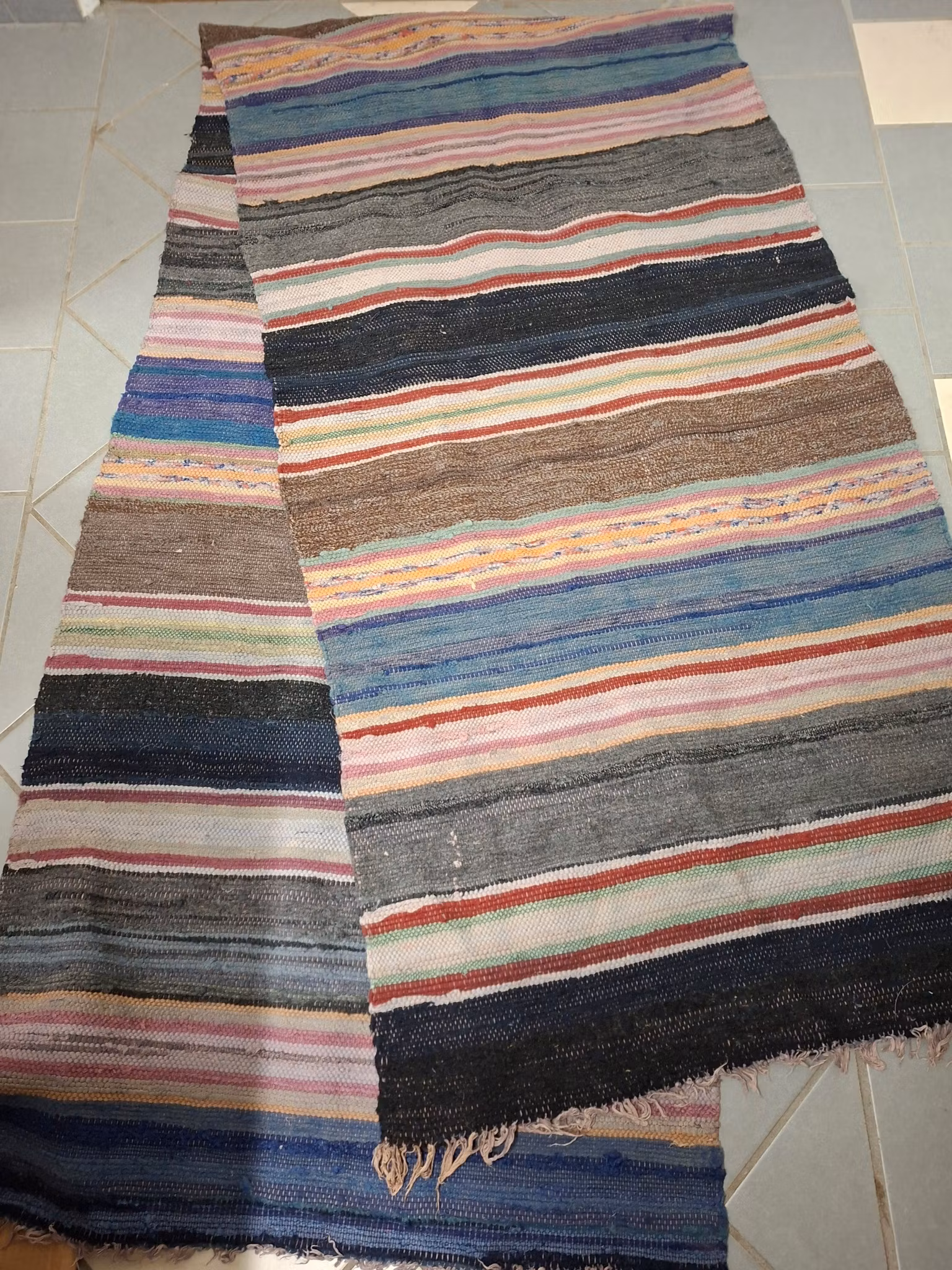 Äldre trasmatta från början av 1900-taletAnvänt bruksskick. Slitna / dåligt med fransar.Tvättad.