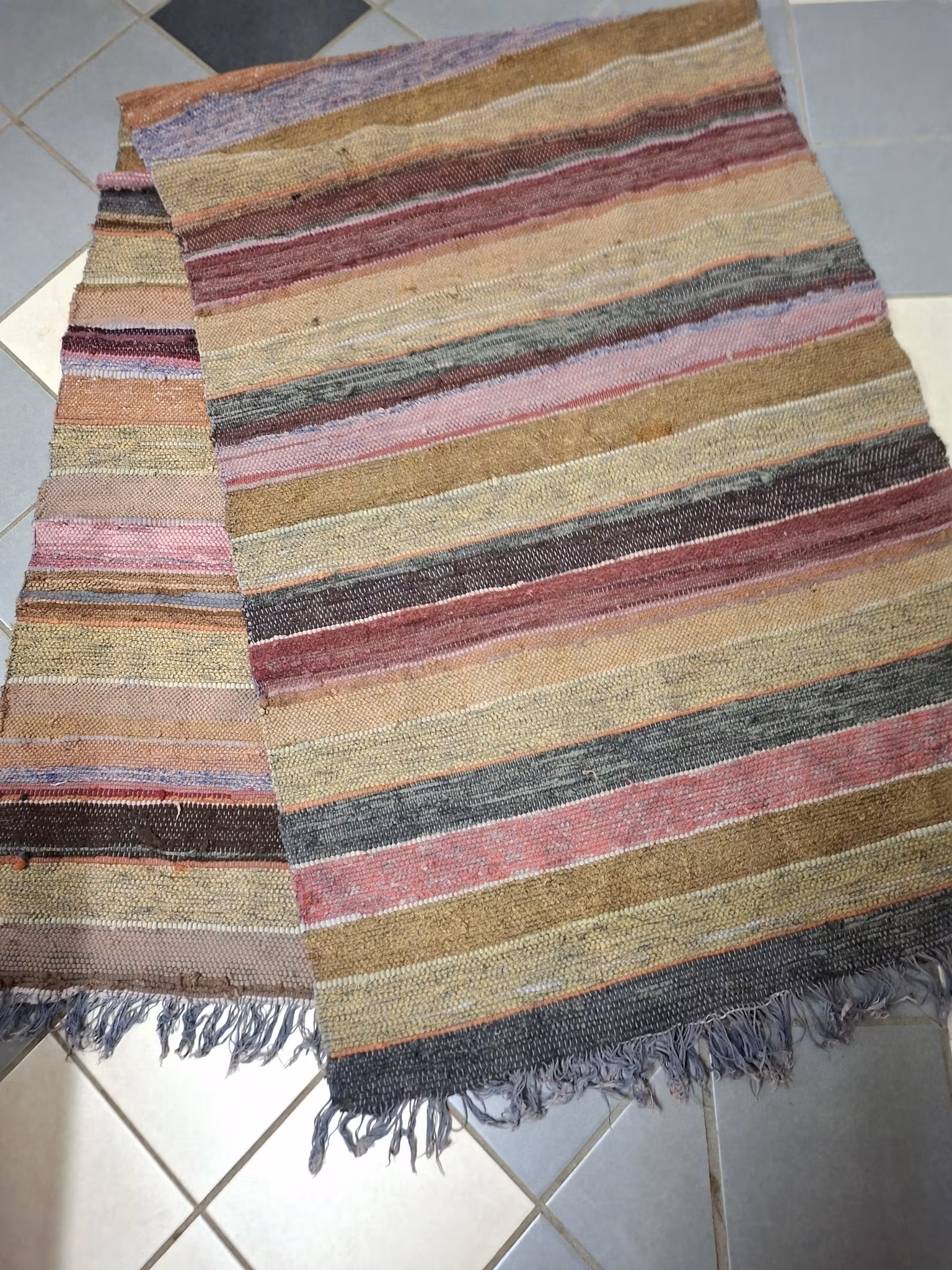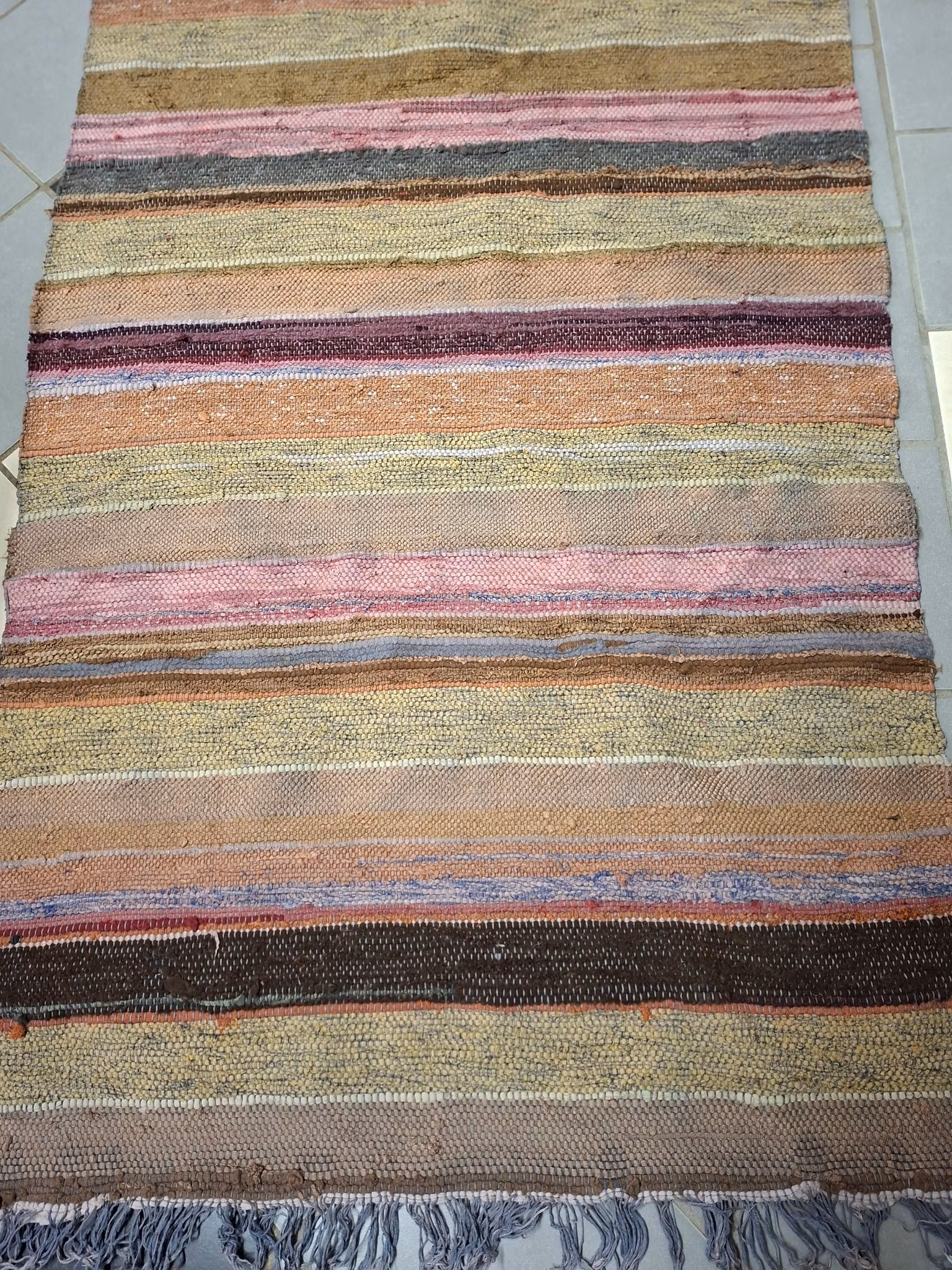Äldre trasmatta från början av 1900-taletAnvänt bruksskick. Slitna fransar.Tvättad.