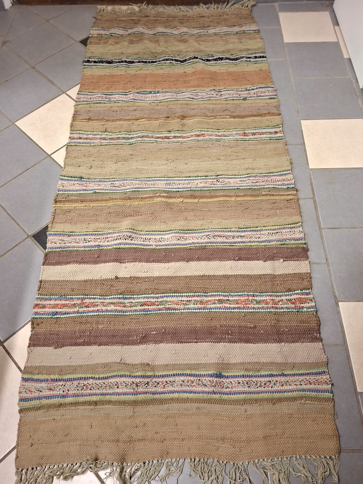 Trasmatta brun beige liten äldre allmoge 1900-tal 157 cm x 67 cmÄldre trasmatta från början av 1900-taletAnvänt bruksskick. Slitna fransar.Tvättad.