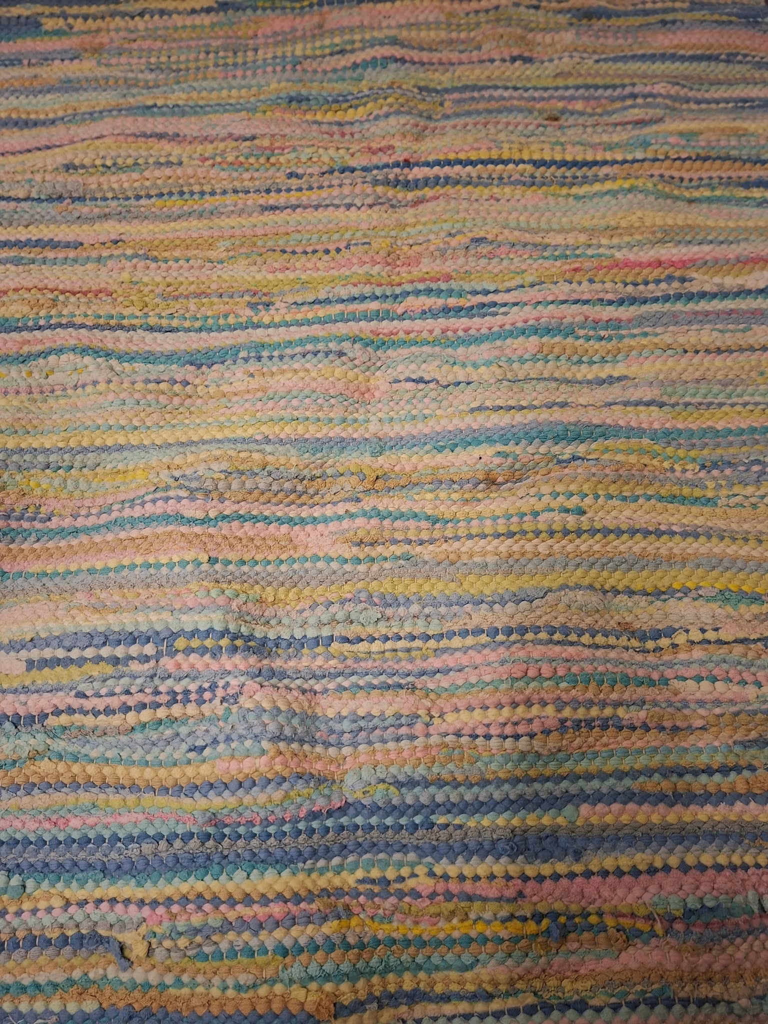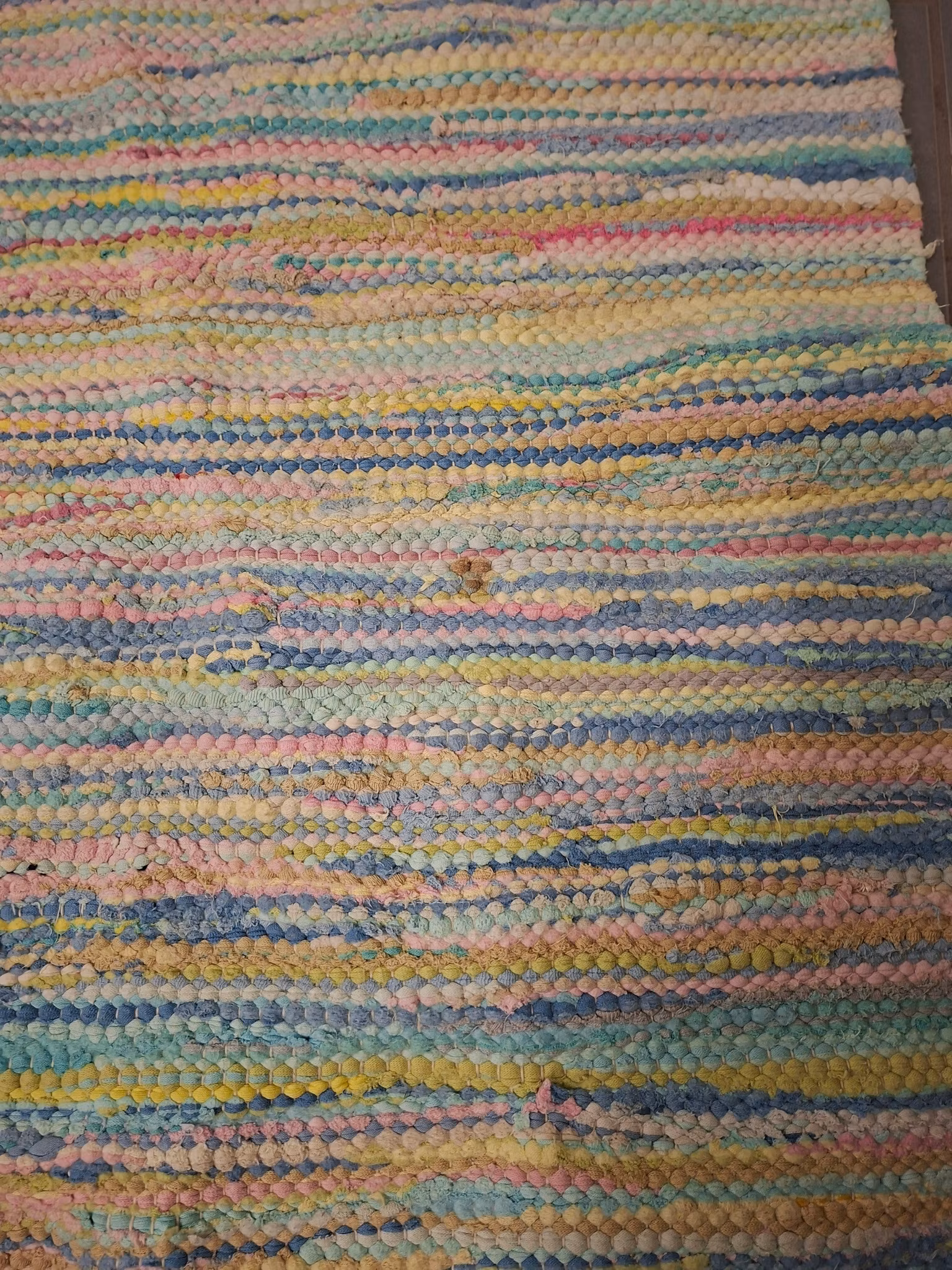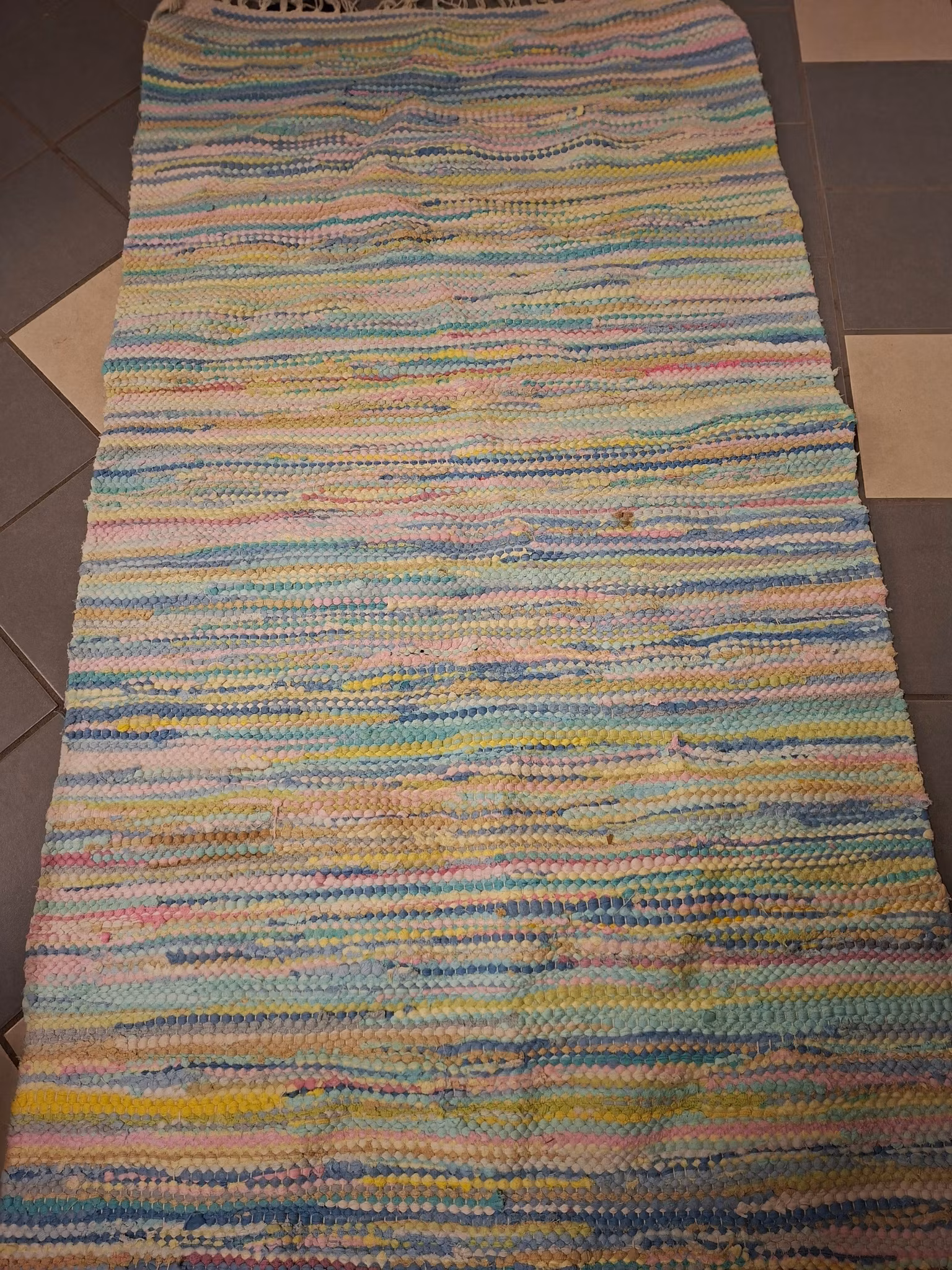 Trasmatta flerfärgad i härligt ljusa våriga och pastelliga färger 200 cm X 77 cmTrasmatta i ljusa och pastelliga fräscha färger.Använt bruksskick. En stor fläck