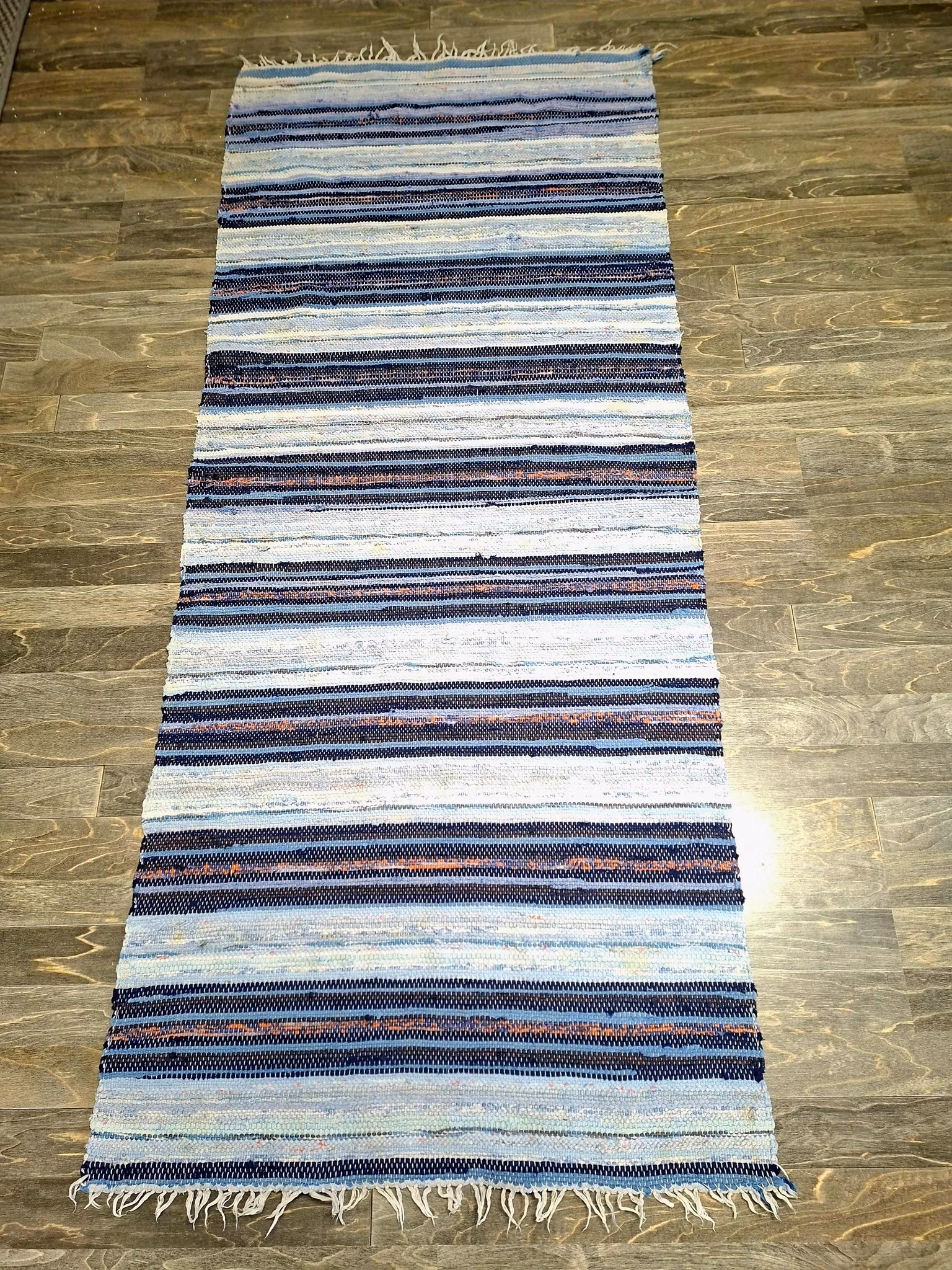Trasmatta mörkblå blå 172 X 72 cmBegagnad trasmatta i använt bruksskick, något slitage och någon fläckMått är ungefärligt och mätt utan fransarna.Tvättad