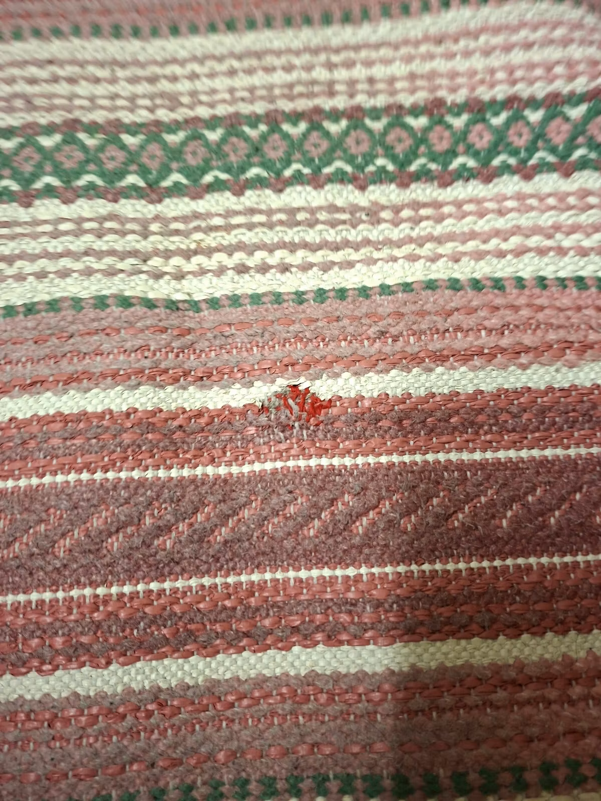 Trasmatta plast och tyg rosa grön 280 cm X 68 cmTrasmatta i plast och tygOtvättad. Lagad på ett ställe annars fint skick.Luktar lite plastigt som de flesta plas