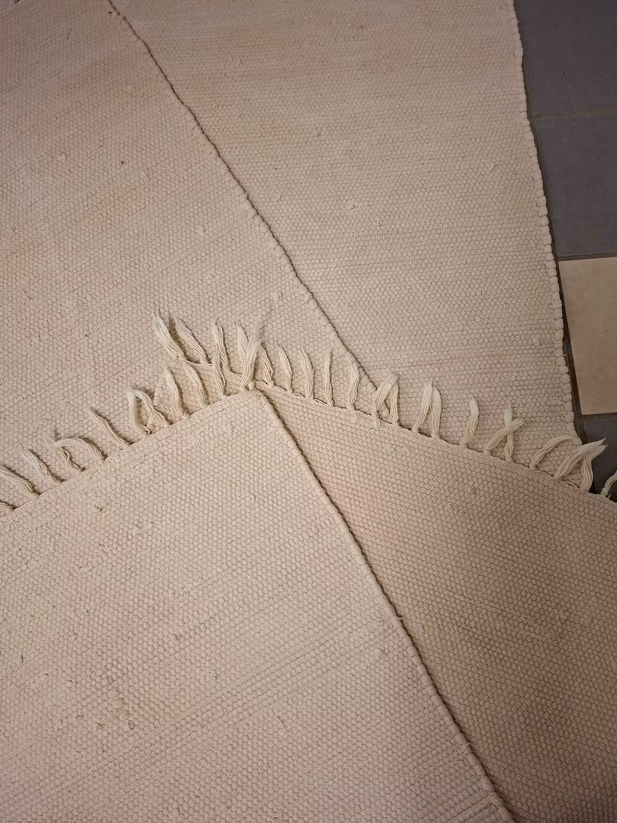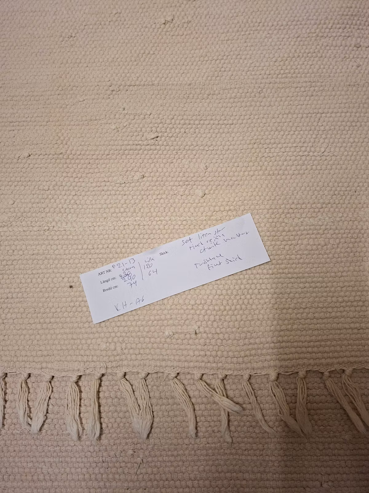 Trasmattor 2 st offwhite en stor och en liten matta 240 cm X 74 cm och 120 cm X 64 cmTvättade.Den stora mattan har en svag rödfärgning på ett ställe i väven, se