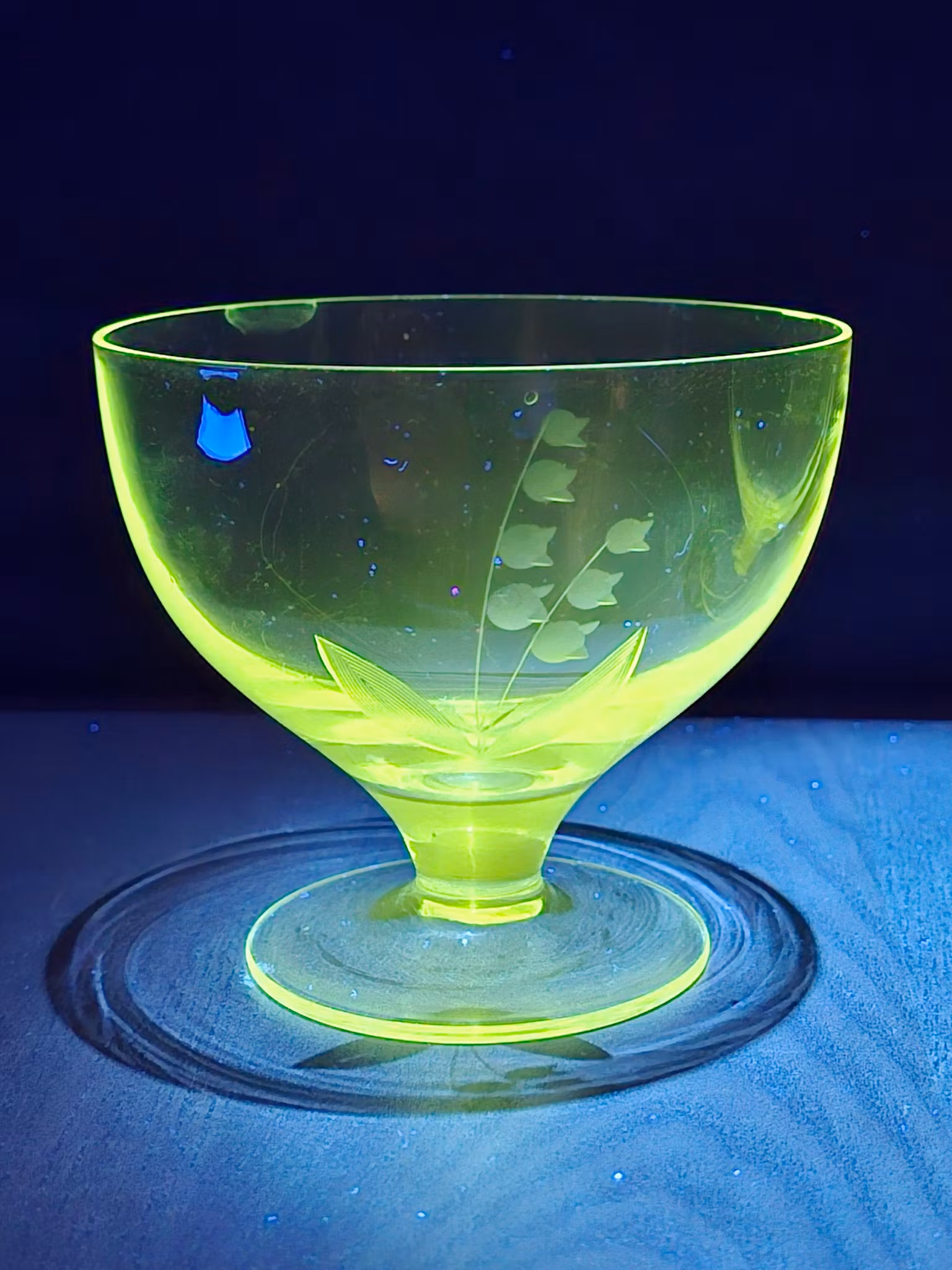 Dessertskål på fot Uranglas äldre med ristad dekor tunt glas 1 st glasÄldre skål på fot dessertskål i tunt glas. Uranglas eller ManganglasSäljes styckevisHöjd c