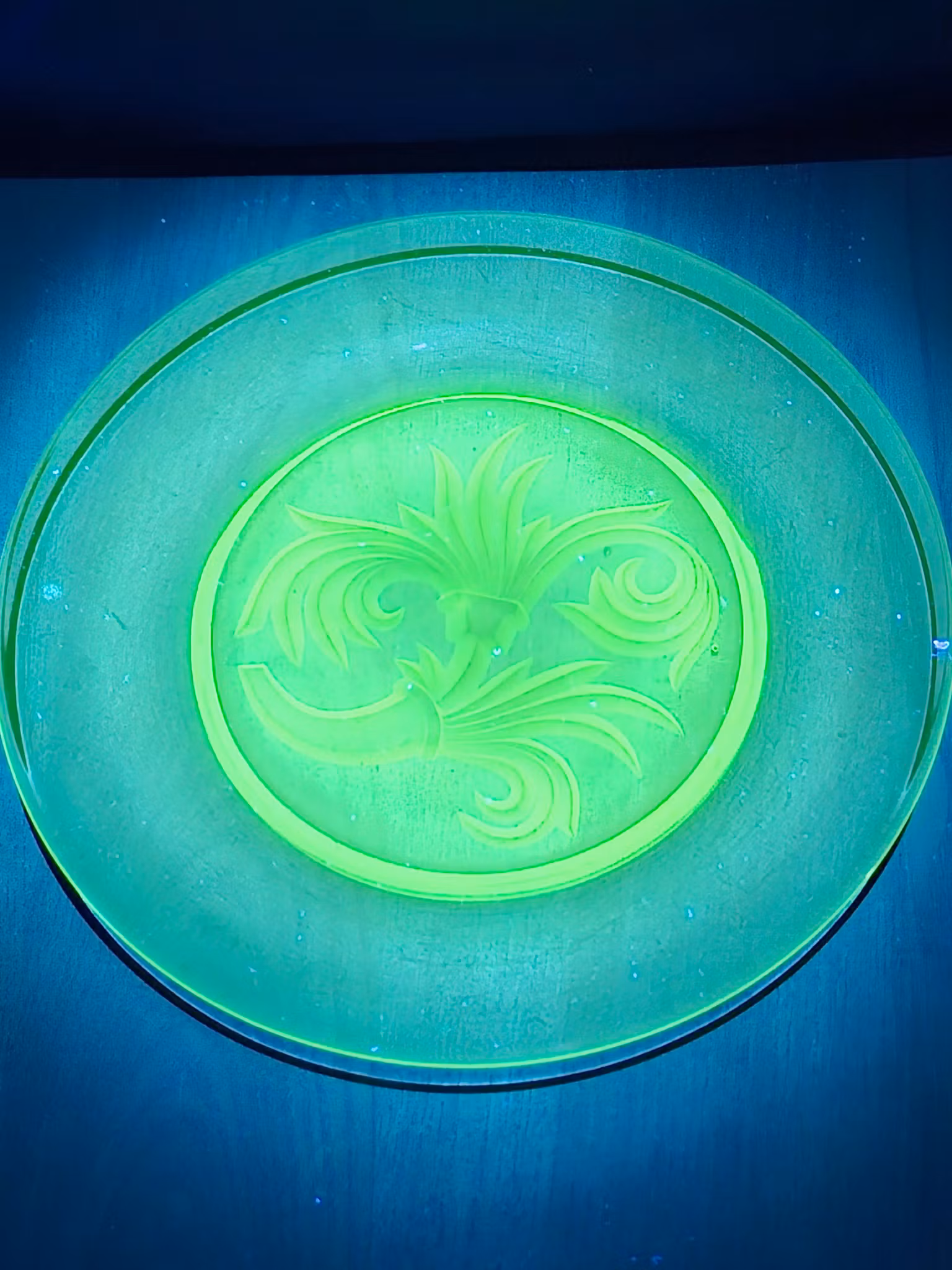 Pressglas tallrik i blått Edvin Ollers, Elme Glasbruk, UranglasBegagnat använt bruksskick, synligt använd med små repor.