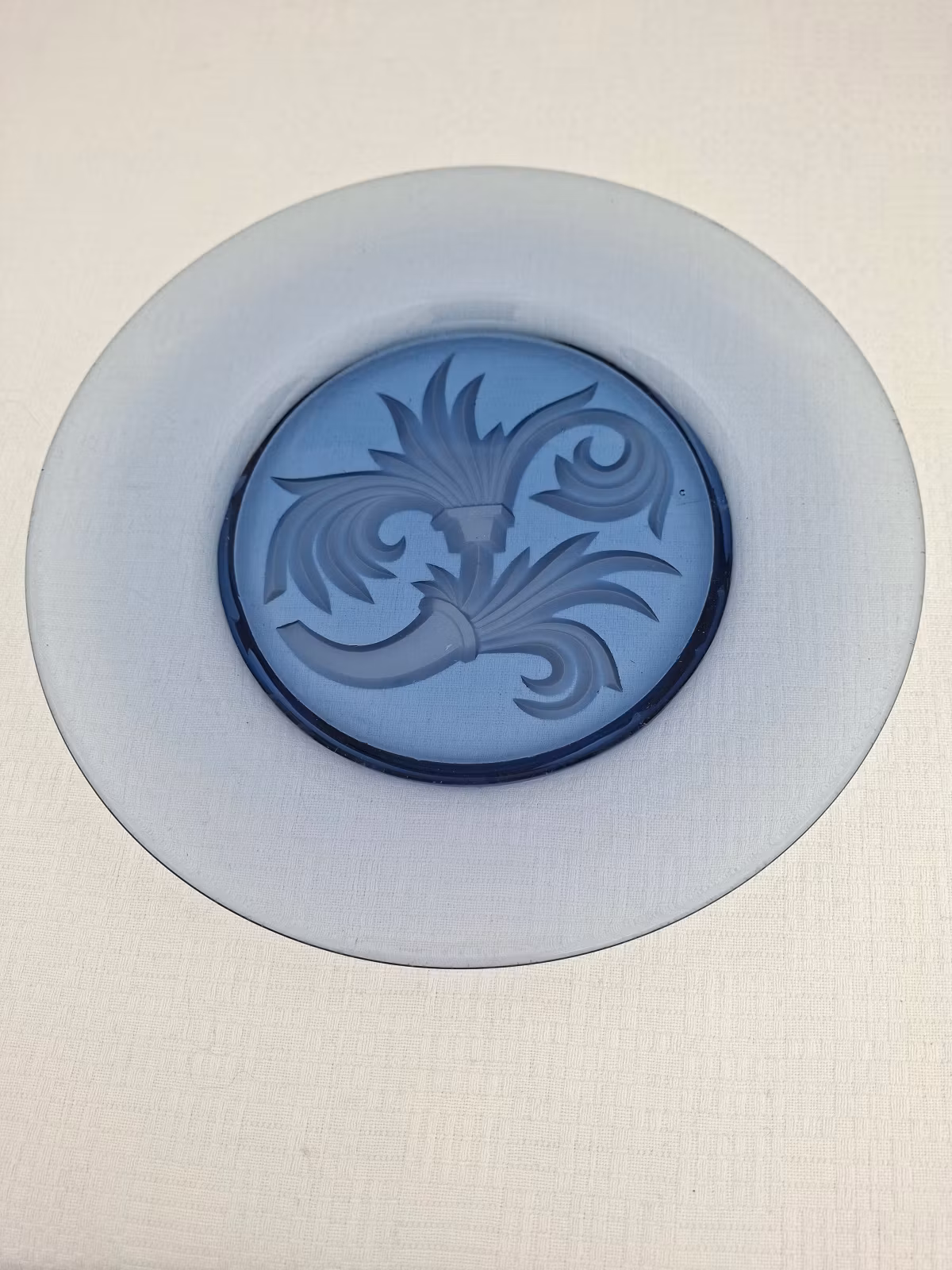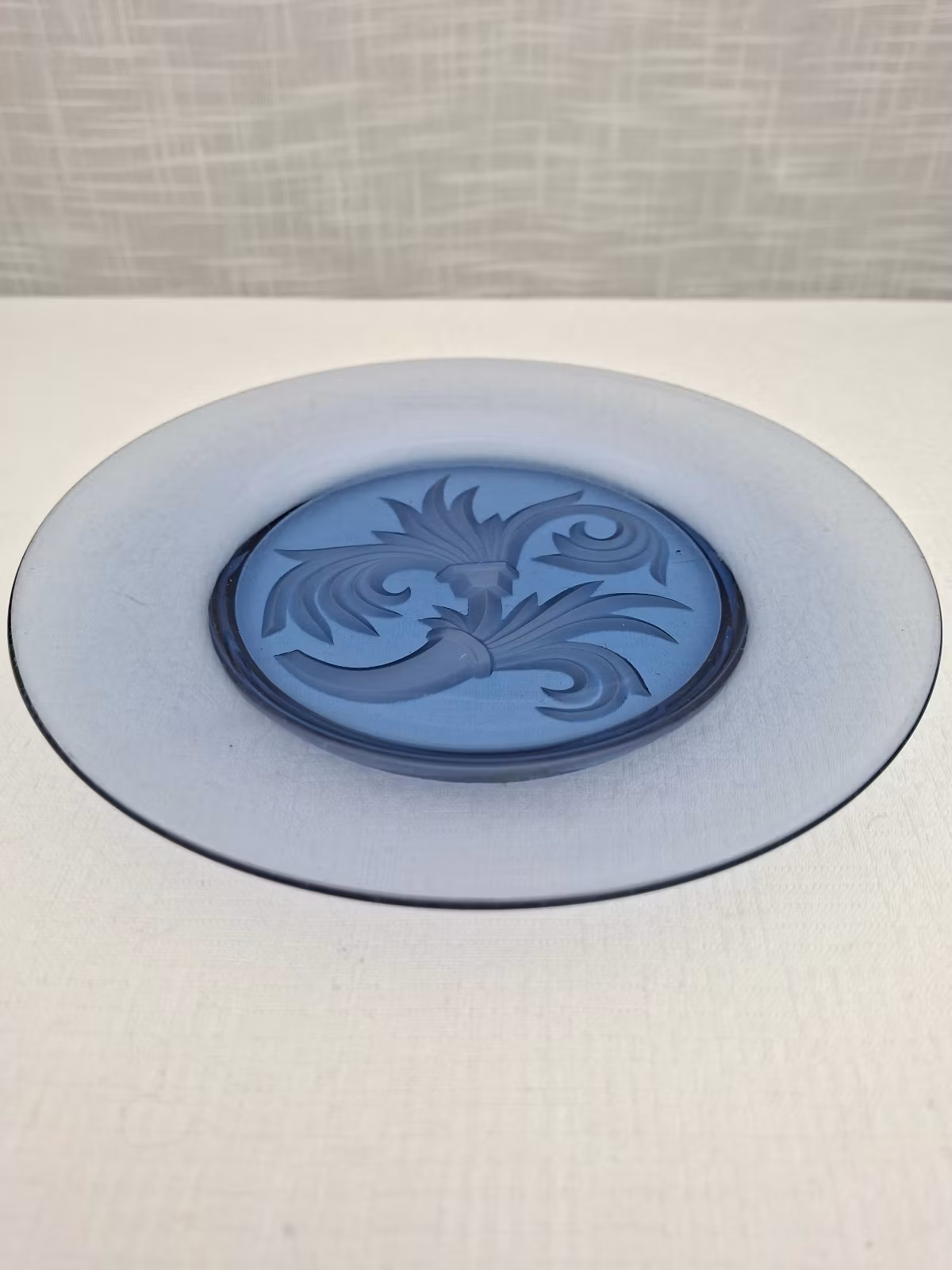 Pressglas tallrik i blått Edvin Ollers Elme Glasbruk Uranglas