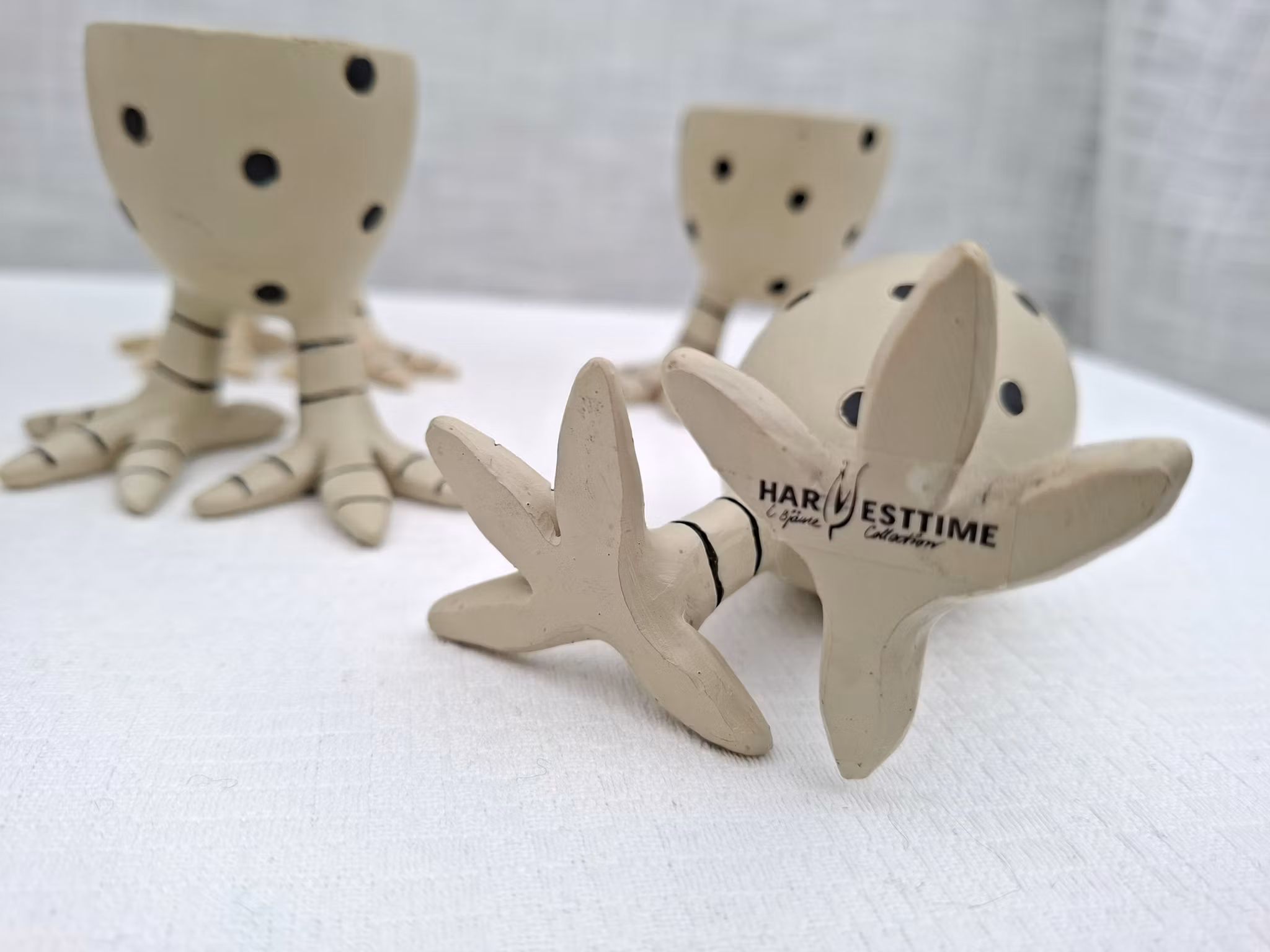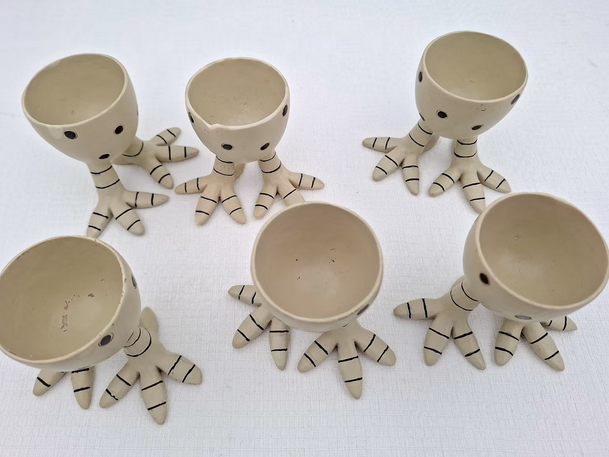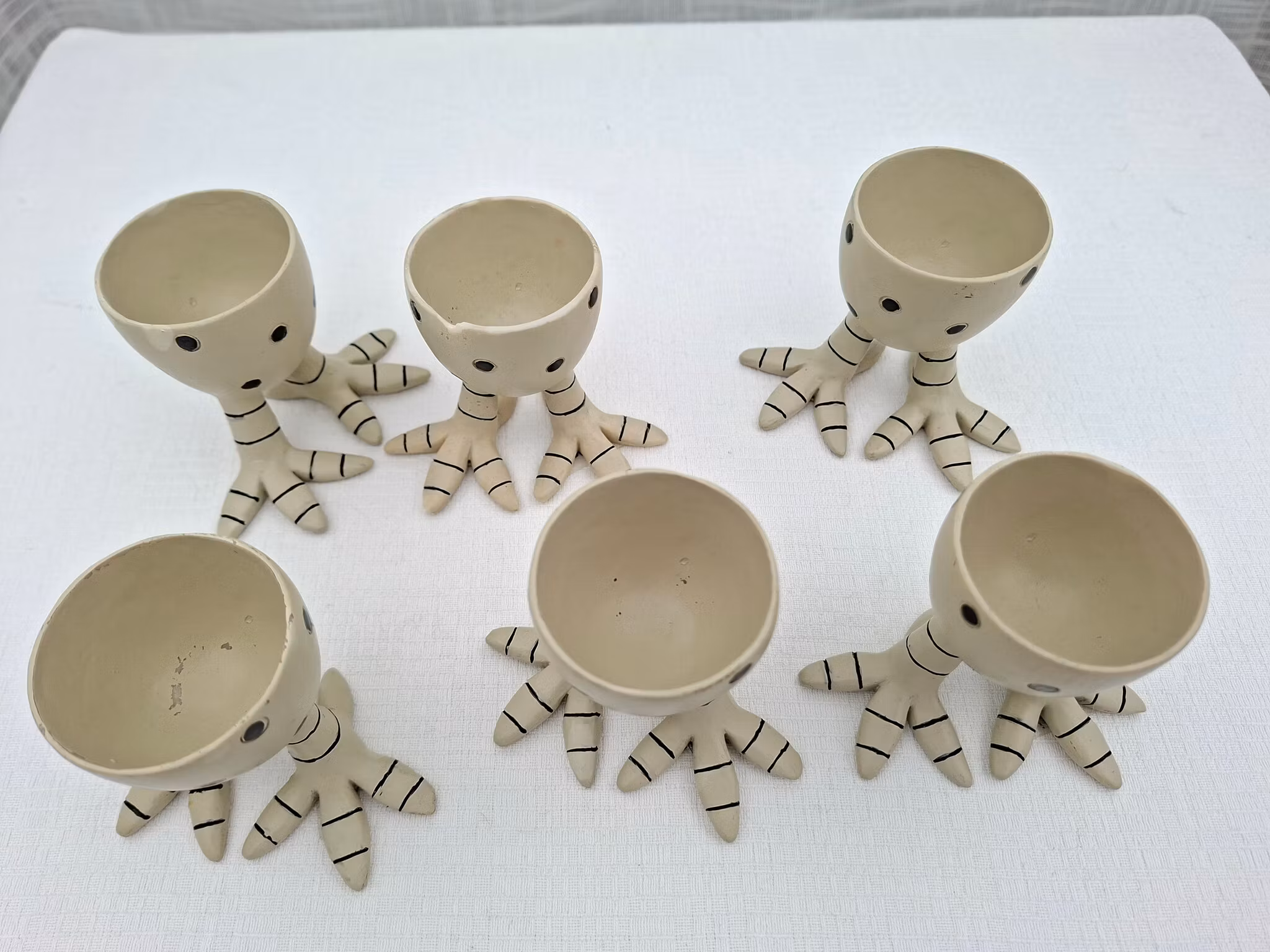 Äggkoppar 6 st med kyckling fötterAnvänt bruksskick så synligt använda och någon skada på ett par av dem. Se bilder för egen bedömning av skick