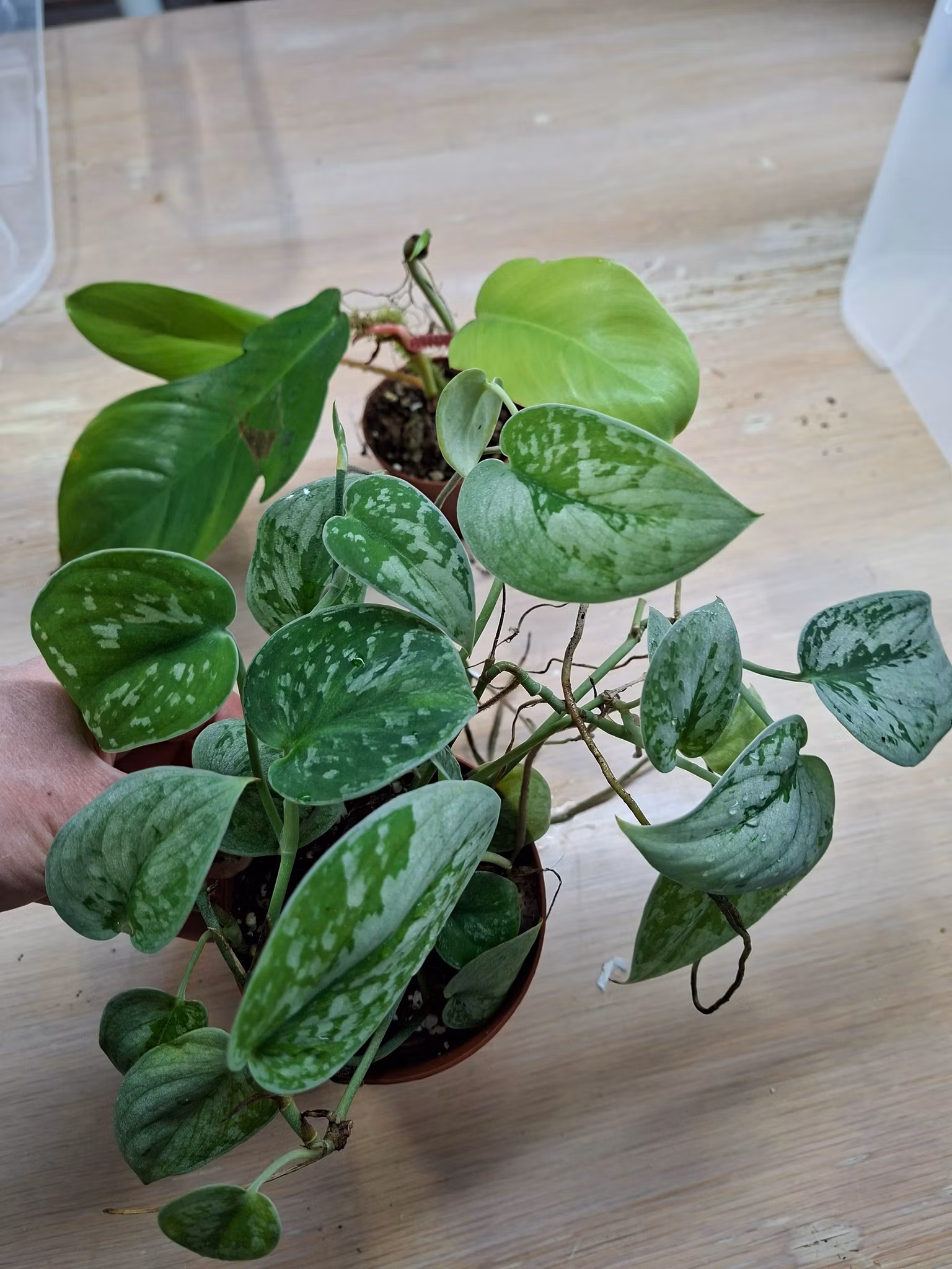 Scindapsus Silvery Ann och Philodendron Squamiferum Mossranka plantor
