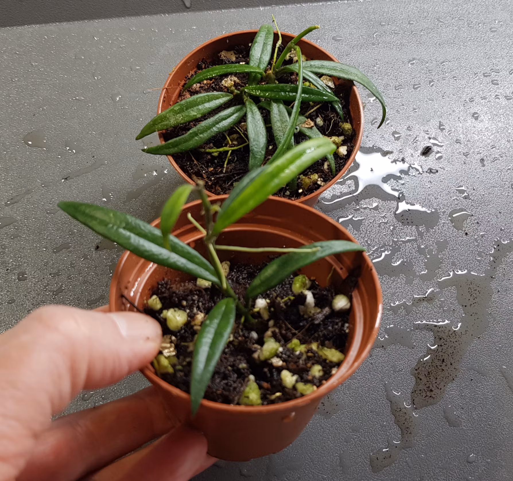 Hoya pauciflora är en söt liten hoya med smala blad. Blommar med stora vita blommor med röd mitt.