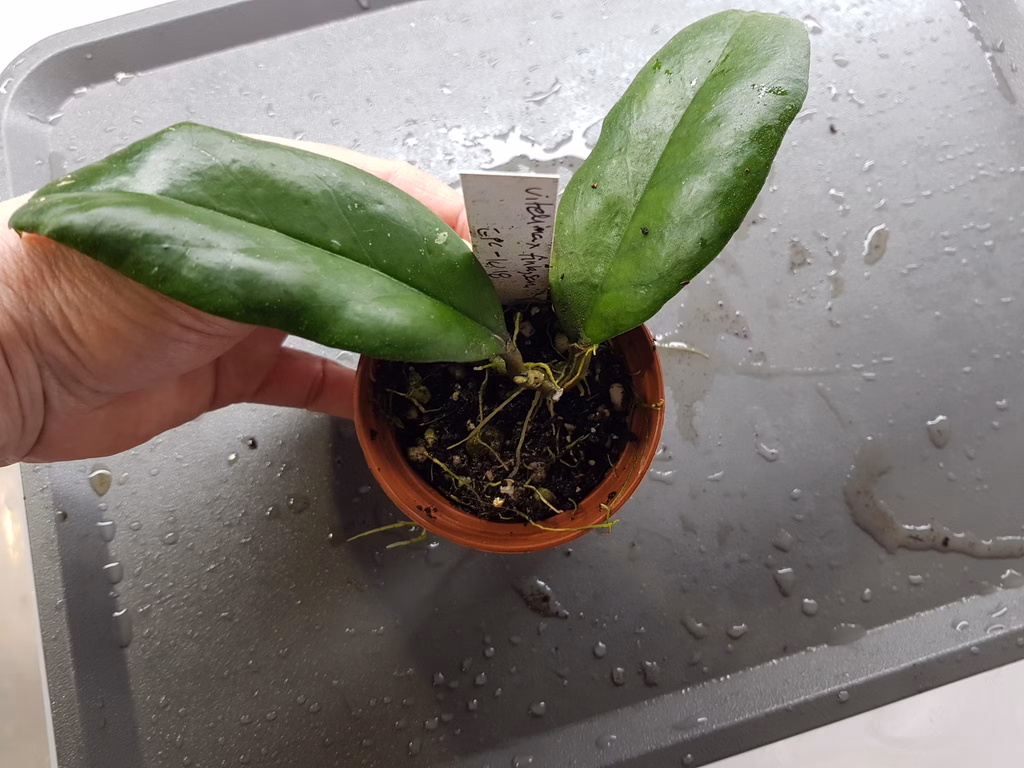 Hoya vitellina X finlaysonii EPC-1018 - rotadvacker hybrid. Den får fantastiskt vackra blad. Bladen får en röd kant om den odlas ljust.